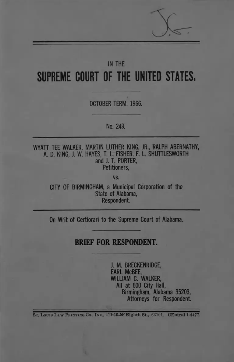 Brief Collection, LDF Court Filings. Walker v. City of Birmingham Brief for Respondent, 1966. a8b4a54d-c89a-ee11-be36-6045bdeb8873. LDF Archives, Thurgood Marshall Institute. https://ldfrecollection.org/archives/archives-search/archives-item/92adf30f-baf5-4737-bf5a-30e5a3cd957e/walker-v-city-of-birmingham-brief-for-respondent. Accessed December 15, 2025.