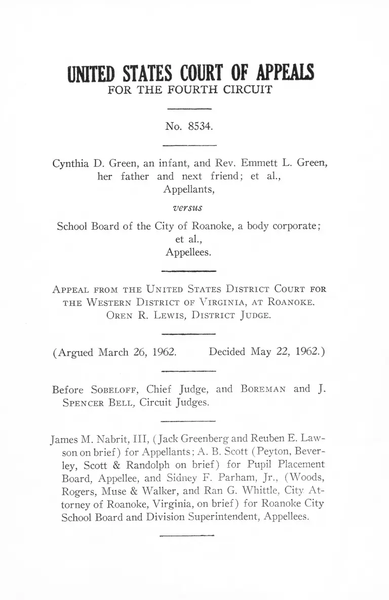 Brief Collection, LDF Court Filings. Green v. City of Roanoke School Board Opinion, 1962. 87f80c33-b49a-ee11-be36-6045bdeb8873. LDF Archives, Thurgood Marshall Institute. https://ldfrecollection.org/archives/archives-search/archives-item/93c995cb-0b60-44a9-be6a-a338494d2991/green-v-city-of-roanoke-school-board-opinion. Accessed December 16, 2025.