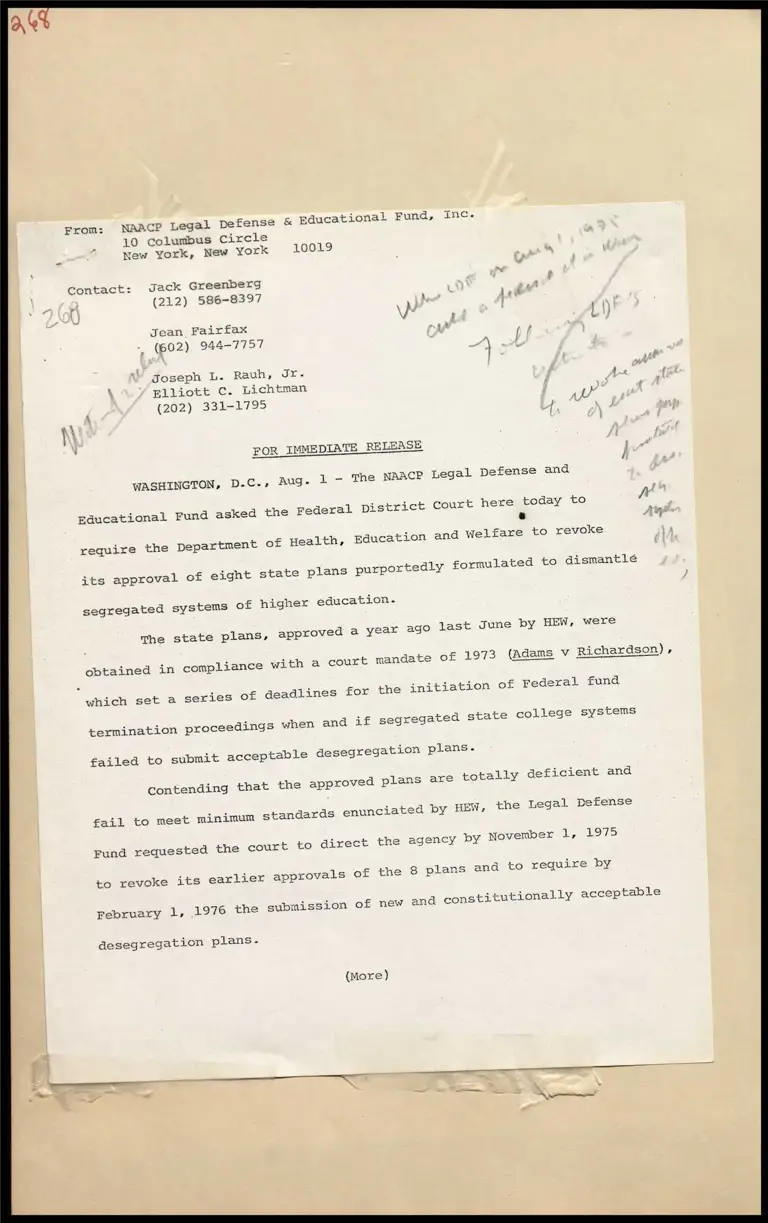 • Press Releases, Volume 6. Department of Health, Education and Welfare Required to Revoke Deficient Desegregation Plans for 8 States, 1975. 85af1920-bb92-ee11-be37-00224827e97b. LDF Archives, Thurgood Marshall Institute. https://ldfrecollection.org/archives/archives-search/archives-item/c9b4bb33-f930-4e4f-8521-3f177b0fe437/department-of-health-education-and-welfare-required-to-revoke-deficient-desegregation-plans-for-8-states. Accessed December 15, 2025.